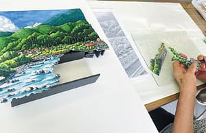 作品制作は単純な作業の繰り返しですが、絵に立体感が生まれ表情が変わる様子や、額に入れた瞬間の達成感は、絵画や手芸とはまた違った魅力があるそうです。家族や友人への特別な贈り物として、年齢を問わず長く続けられる趣味として、作品作りに取り組んでいます。それぞれの手から生まれた繊細で躍動感あふれる作品は、8月1日~31日まで「あぐりの湯こもろ」に展示されるので、「シャドーボックスの奥深い世界をぜひのぞいてみてください」と仲間たち。作品を通してシャドーボックスの楽しさを伝えてゆくことでしょう。