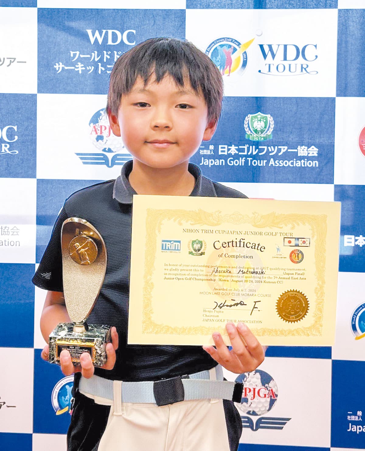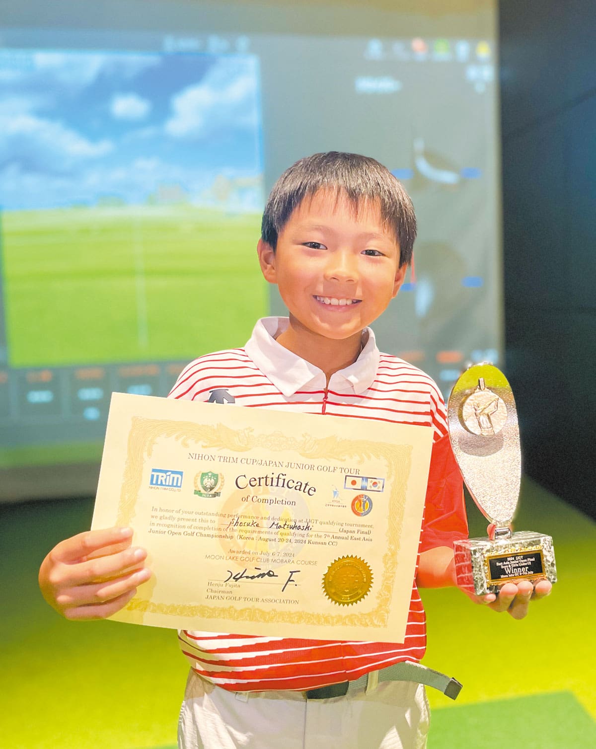 4年生は高学年なので出場できる試合の数が増え、年間10試合ほどこなしています。2024年初めに「全日本ヒルズ&東アジア国際ジュニア選手権日本代表選抜予選会10歳以下の部」で優勝し、8月に韓国で開催された「東アジア国際ジュニアゴルフ選手権」に日本代表として出場しました。父親から「大会に出場するからには目標を持つように」と言われているので、常に大会では「1位を取るぞ!」と思い挑んでいます。国際大会も当然1位が目標でした。とにかく体が固まってしまうとうまくいかないので、試合前は体が固まらないようにジャンプをして体をほぐしたり、意識して体を動かすようにしていました。日本代表選手団の中では最上位の成績でも、国際大会はレベルが高く表彰台には届きませんでしたが、プレーも精神面も成長できたと思っています。真っ直ぐ飛ばせるのが強みだと思っているので、これからもコーチや指導してくださる方のアドバイスを聞いて強い選手になれるように練習していきたいです。