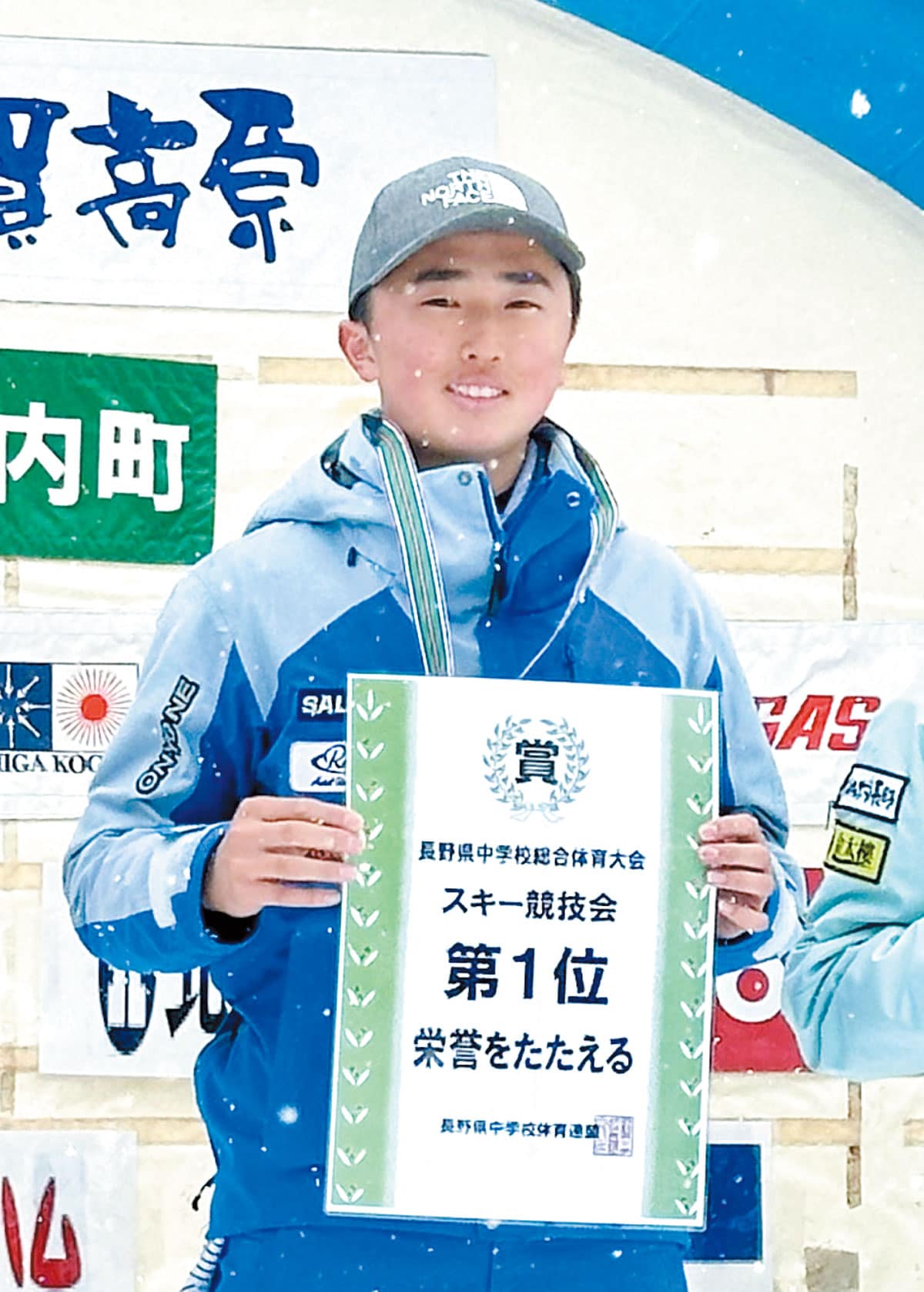 小学1年生の時に東御市の湯の丸ジュニアスキークラブに加入し、本格的に競技に取り組むようになりました。小学6年生のときに新潟の苗場で開催されたワールドカップを観戦し、「自分もいつかワールドカップに出場したい」と思いました。大会では必ず結果を残したいと思っていますが、中学1・2年時は成績が振るわず、体幹を意識したトレーニングや、体重を増やすための食事の見直し、気持ちを維持しながら競技と向き合う訓練をしました。その結果、安定した滑りができるようになり、中学3年生では長野県中学校総合体育大会冬季大会スキー竸技会で2種目優勝。全国中学校スキー大会に出場することができました。