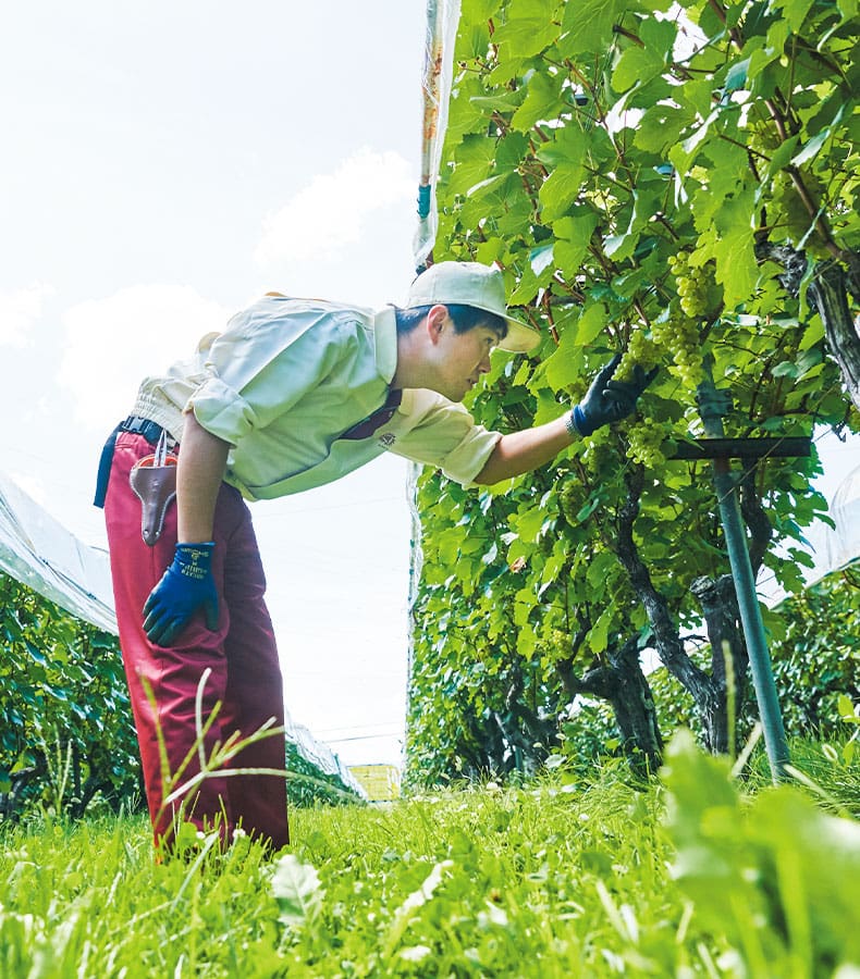 一般的に高品質なワインを造る過程において、ぶどうの樹齢は重要とされ、特に30年を越える樹に実るぶどうは、安定感のある高品質なワイン造りに最適と言われています。マンズワインは日本ワインの中でも歴史が古く、ワイナリー敷地内には樹齢40年程のシャルドネが植えられた畑もあります。「私たちが今、高品質なワイン造りを行えるのは、先人たちの努力の賜物です。感謝しかありません」と小諸ショップスタッフの森さんは言います。