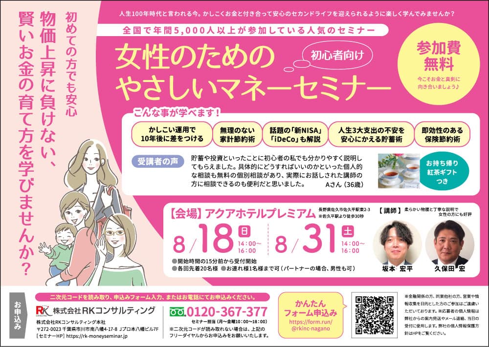 EVENT 8月18日・31日に「女性のため のやさしいマネーセミナー」 株式会社RKコンサルティング 2024.08.21 10年後に差をつけるかしこい運用、無理のない家計節約術、話題の新NISAやiDeCoなど、物価上昇に負けない賢いお金の育て方を学べる人気セミナーが、8月18日と31日にアクアホテルプレミアムで開催されます。参加費無料、お持ち帰り紅茶ギフト付き。 女性のため のやさしいマネーセミナー 株式会社RKコンサルティング TEL 0120-367-377 会場 アクアホテルプレミアム(佐久平駅東2-3) 日時 8月18日(日)・31日(土)14:00~16:00 参加費 無料 Tweet Share