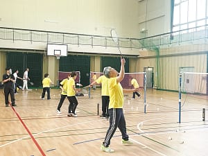 練習はバドミントン経験者で柔道整復師の資格を持つ横山コーチが指導。まずウォーミングアップとして、シニア世代に必要なストレッチや筋トレを30分間しっかりと行ったあとに、バドミントンの練習をします。
