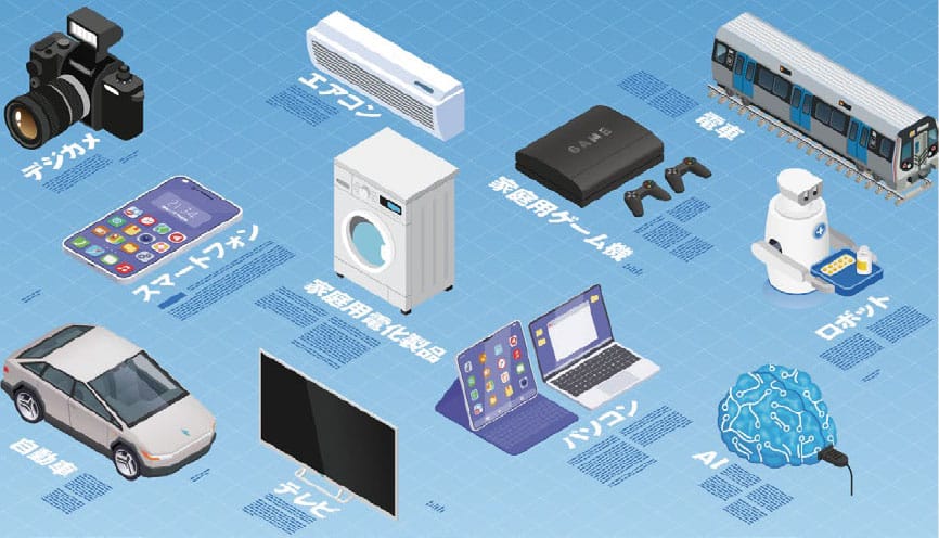 スマートフォンやPC、ゲーム機などの身近なものから、テレビ・エアコンなどの家庭用電化製品、大きなものでは自動車や電車まで、様々な製品に使われる半導体は、私たちの生活に必要不可欠なものです。