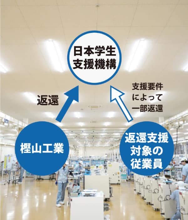 期間は最長5年間。月額最大3万円、5年間で最大180万円を、会社が代理で日本学生支援機構へ返還します。対象は今年4月以降に入社した新卒採用社員と中途採用社員。樫山工業は、未来を担う若手社員をサポートします!