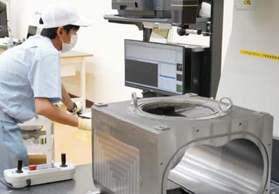調達した部品は、寸法に誤りがないかを三次元測定機を使って検査します。重要な部品は1000分の1ミリ単位で測定します。